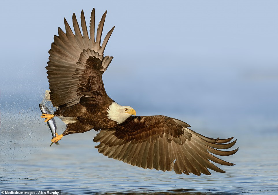 Khoảnh khắc này được nhiếp ảnh gia Alan Murphy ghi lại ở Alaska, Mỹ. Con đại bàng bổ nhào xuống nước với tốc độ 160 km/h rồi dùng móng vuốt quắp chặt con cá.