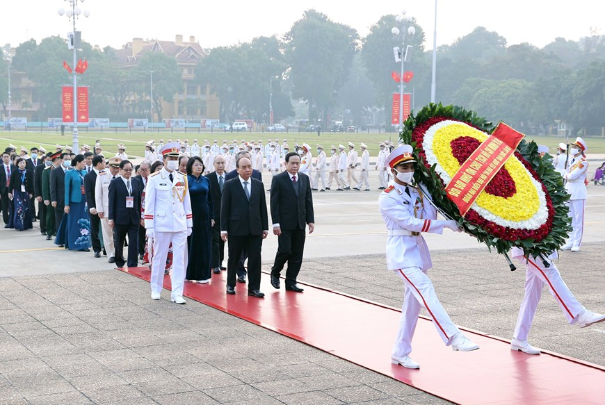 Thủ tướng Nguyễn Xuân Phúc, Chủ tịch Hội đồng Thi đua-Khen thưởng ương, dẫn đầu Đoàn đại biểu dự Đại hội Thi đua yêu nước toàn quốc lần thứ X đặt vòng hoa và vào Lăng viếng Chủ tịch Hồ Chí Minh. (Ảnh: Thống Nhất/TTXVN)