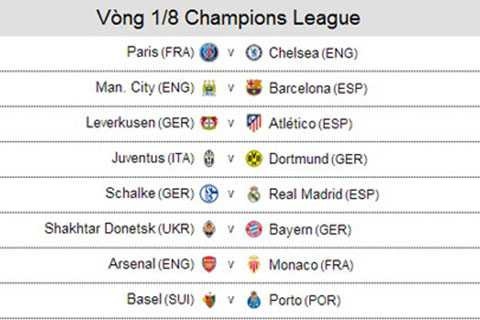 Những lá thăm may rủi đã mang tới 2 cuộc gặp thượng đỉnh ở vòng 1/8 Champions League năm nay, đó là PSG - Chelsea và Man City - Barca. Ngoài ra cặp đấu giữa Juventus - Dortmund cũng rất đáng chú ý. Đây là sự lặp lại của trận chung kết Champions League năm 1997.