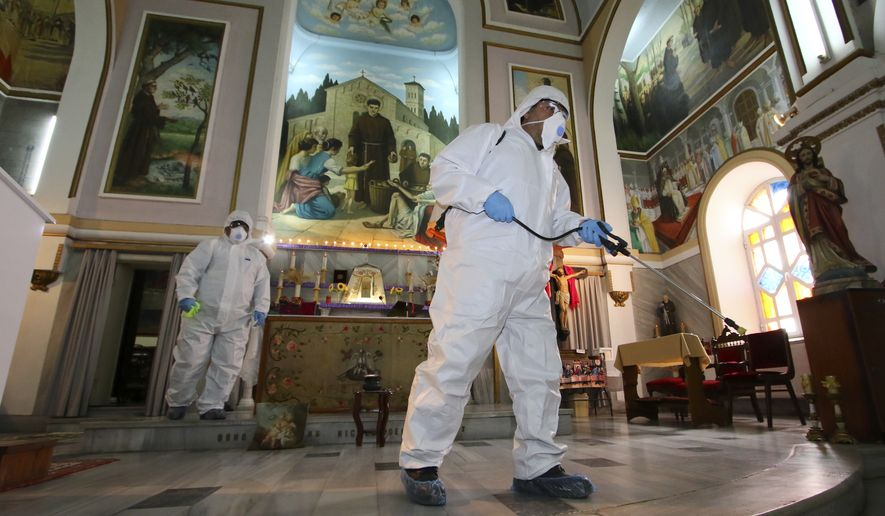 Nhân viên y tế phun khử trùng một nhà thờ ở Thổ Nhĩ Kỳ. (Ảnh: AP)