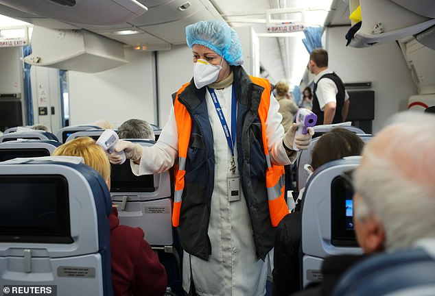 Nhân viên y tế đo nhiệt độ cho hành khách vừa đáp xuống sân bay Boryspil của Ukraine. (Ảnh: Reuters)