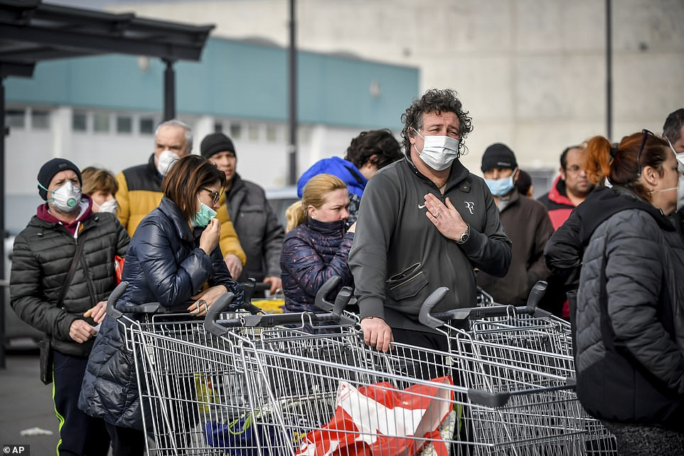 Mọi người đeo khẩu trang khi họ xếp hàng bên ngoài một siêu thị ở Casalpusterlengo, miền bắc Italy.