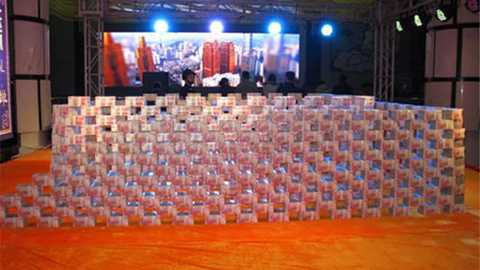 | Những cọc tiền mới cứng được xếp thành bức tường dài trên sân khấu. |