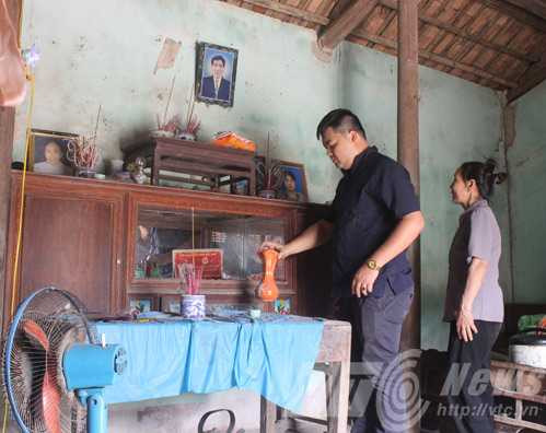 Nhà phong thủy Lê Thái Bình sắp xếp lại bàn thờ, đưa bát hương, di ảnh của chồng Huệ, tức anh Nguyễn Văn Tuấn đặt lên mặt tủ.