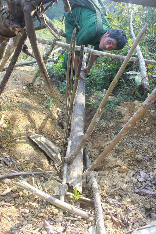 Đi xuyên qua thung lũng, thì gặp một cái bẫy kỳ lạ: Những cái cọc được cắm lộn xộn xung quanh một vạt đất được đào bới. Cây luồng khá lớn được cắm xiên xuống lòng đất. Tôi nghĩ mãi không hiểu đây là thứ gì, thì anh Huy mới giải thích đó chính là bẫy bắt rắn.