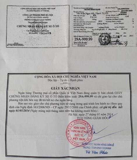 Theo giấy xác nhận của VIBbank, hiện ngân hàng đang giữ biển số 29A-999.99 và chỉ giao lại cho chủ nhân của nó khi bên vay đã trả hết nợ.