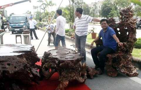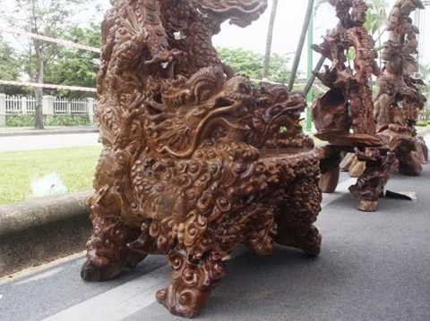 Bộ bàn lũa từ gỗ gù hương được chạm trổ tinh xảo rồng cuốn hổ ngồi khiến khách xem hết sức trầm trồ. Chủ nhân của nó là một người trẻ tuổi ở Chiêm Hóa, Tuyên Quang.