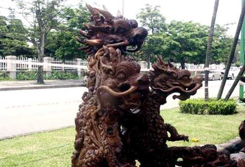 | Điểm nhấn nổi bật nhất của bộ bàn ghế là chiếc “ghế vua”, được chạm hình 5 con rồng đang cuộn từ đầu ghế tới tay vịn, theo thế “ngũ long”. |