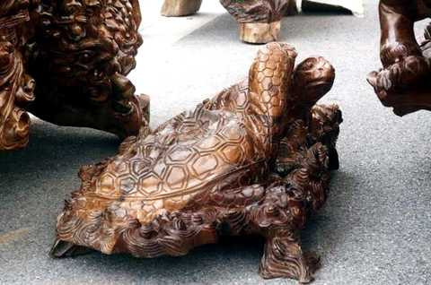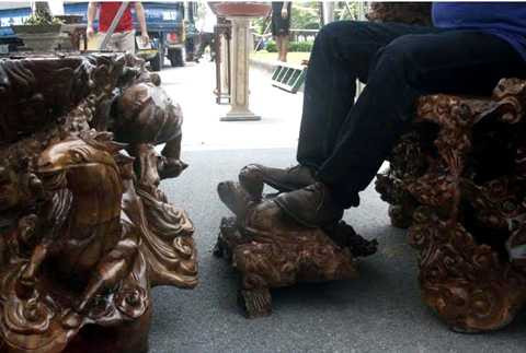 | Một chiếc kệ chân trạm trổ hai con rùa với đường nét tinh xảo, là “phụ kiện” đi cùng để các ông chủ kê chân lên khi ngồi trên ghế vua. |