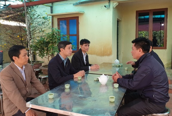 Đại diện lãnh đạo Đại học Giao thông Vận tải (bên trái) thăm hỏi động viê gia đình sinh viên Nguyễn Gia Huy.