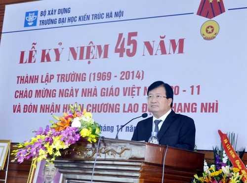 Phát biểu tại buổi lễ, Bộ trưởng Bộ Xây dựng Trịnh Đình Dũng ghi nhận và đánh giá cao những thành tích của Trường Đại học Kiến trúc Hà Nội đối với sự phát triển và kiến thiết đất nước. Bộ trưởng Bộ Xây dựng mong rằng tập thể giáo viên, sinh viên của Trường tiếp tục đoàn kết để xây dựng Trường ngày càng phát triển hơn nữa, đáp ứng yêu cầu của sự nghiệp công nghiệp hóa- hiện đại hóa đất nước.