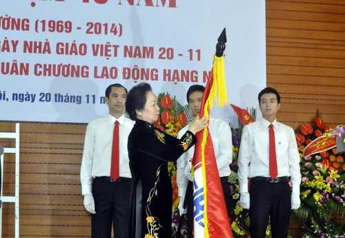 | GS.TS Nguyễn Thị Doan, Ủy viên Trung ương Đảng, Phó Chủ tịch nước gắn Huân chương lên lá cờ truyền thống của Trường |