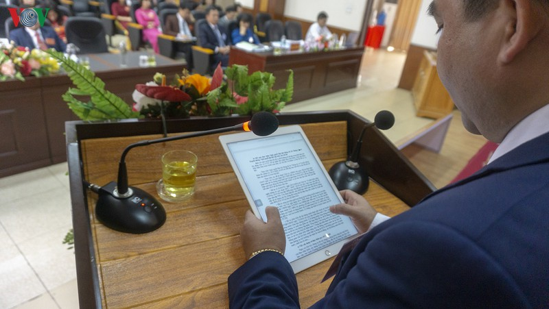 Ông Vương Trinh Quốc - Giám đốc sở Thông tin và Truyền thông tỉnh Lào Cai trình bày báo cáo chính trị tại Đại hội, sử dụng thiết bị thông minh thay vì tài liệu giấy