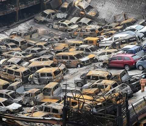 | 500 chiếc xe trị giá khoảng 3,22 triệu USD bị bà hỏa thiêu rụi hôm 4/4 |