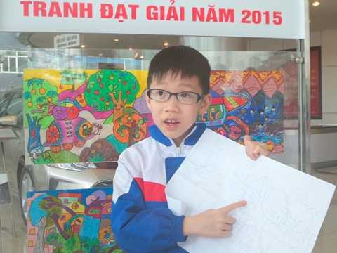 | Em Phạm Quang Hưng, học sinh lớp 3B trường Tiểu học Đoàn Thị Điểm (Hà Nội) nói về ý tưởng của em trên bản phác thảo bức tranh dự thi |