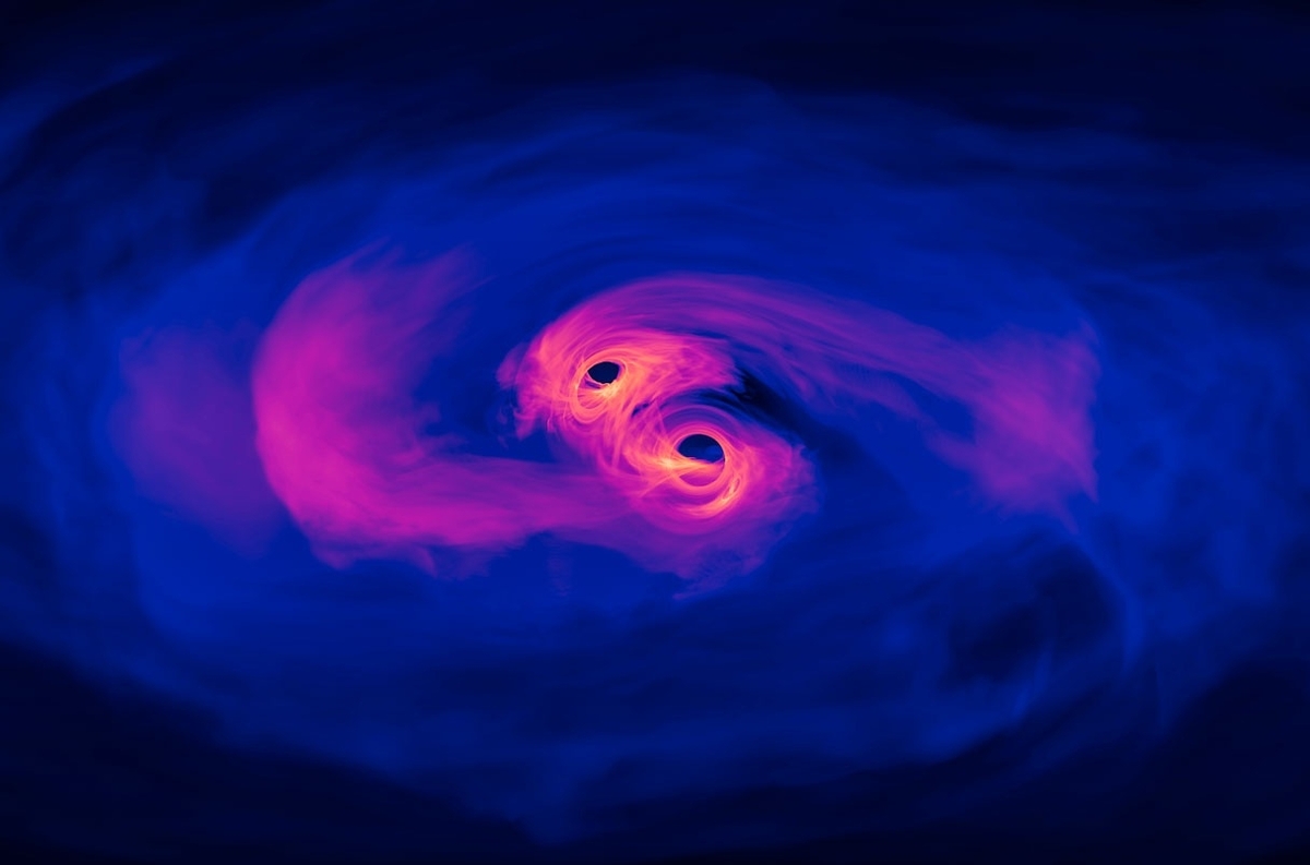 Mô phỏng 2 lỗ đen trong quá trình va chạm và sáp nhập thành một. (Ảnh: NASA’S Goddard Space Flight Center)