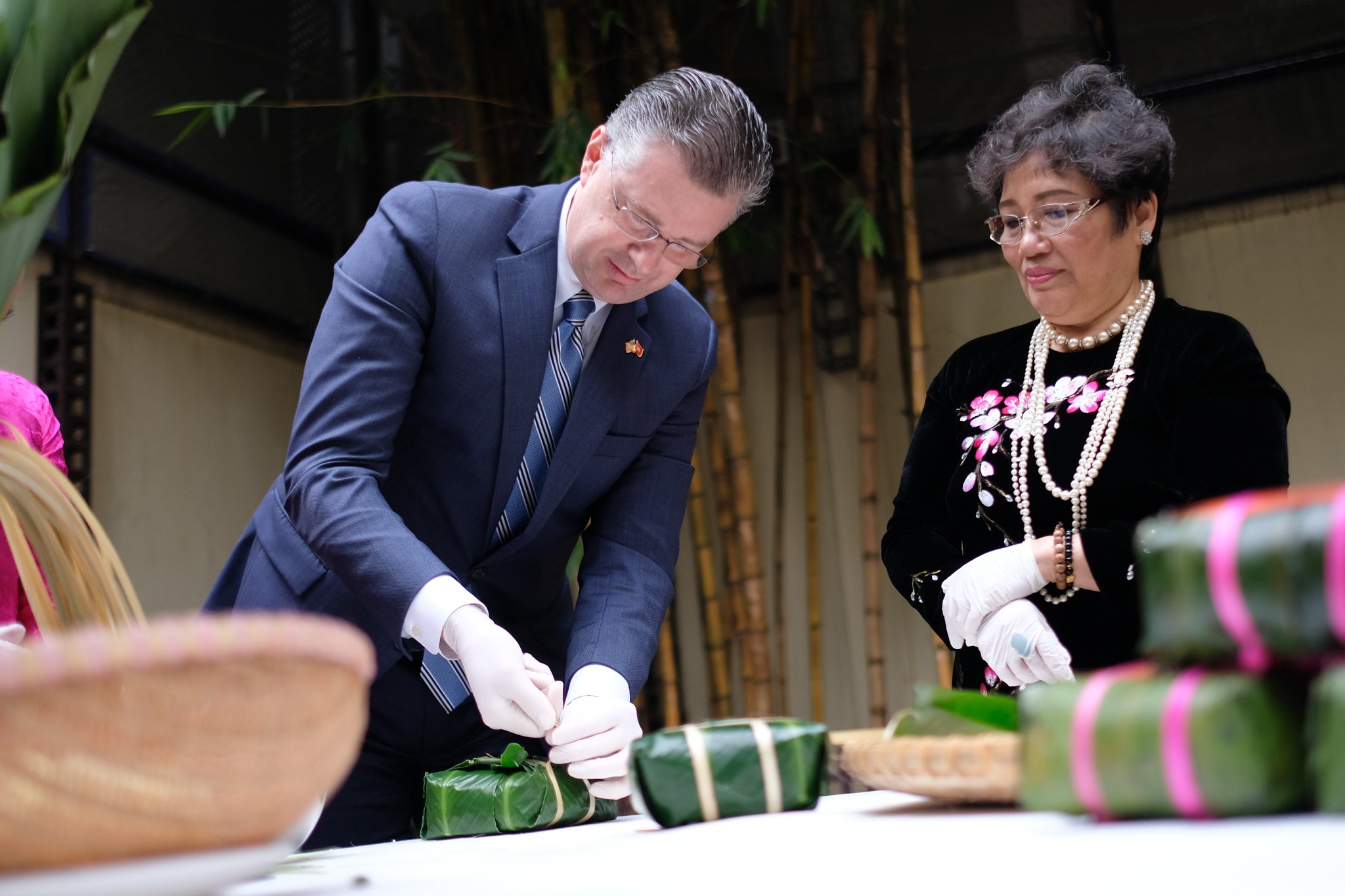 Đại sứ Kritenbrink cho biết, ông từng ăn bánh chưng trước đây và rất thích loại bánh này nhưng chưa từng học cách gói, luộc hay cắt bánh.