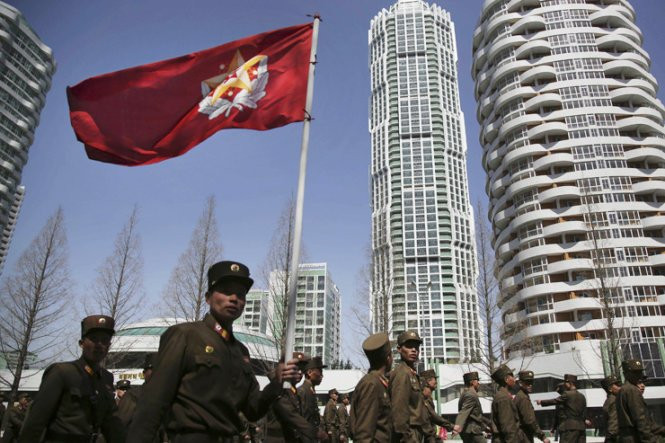 Binh sỹ Triều Tiên đi qua tòa chung cư nằm dọc theo phố Ryomyong tại Bình Nhưỡng, Hàn Quốc, (Ảnh: AP)