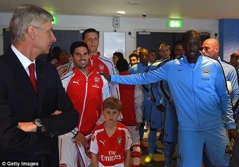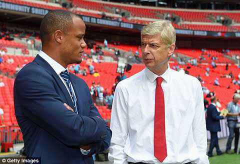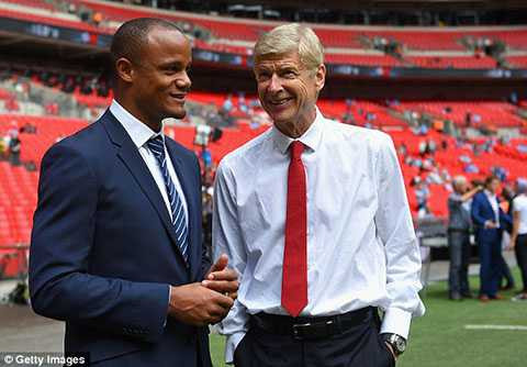 20h27: Thủ quân Vincent Kompany hôm nay không thi đấu. Anh đang nói chuyện cùng HLV Arsene Wenger