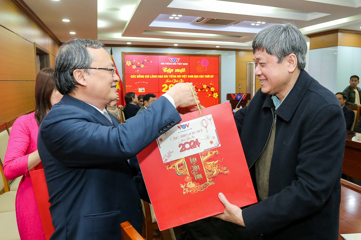 Tổng Giám đốc VOV Đỗ Tiến Sỹ tặng quà nguyên Phó Tổng Giám đốc VOV Nguyễn Thị Kim Cúc.