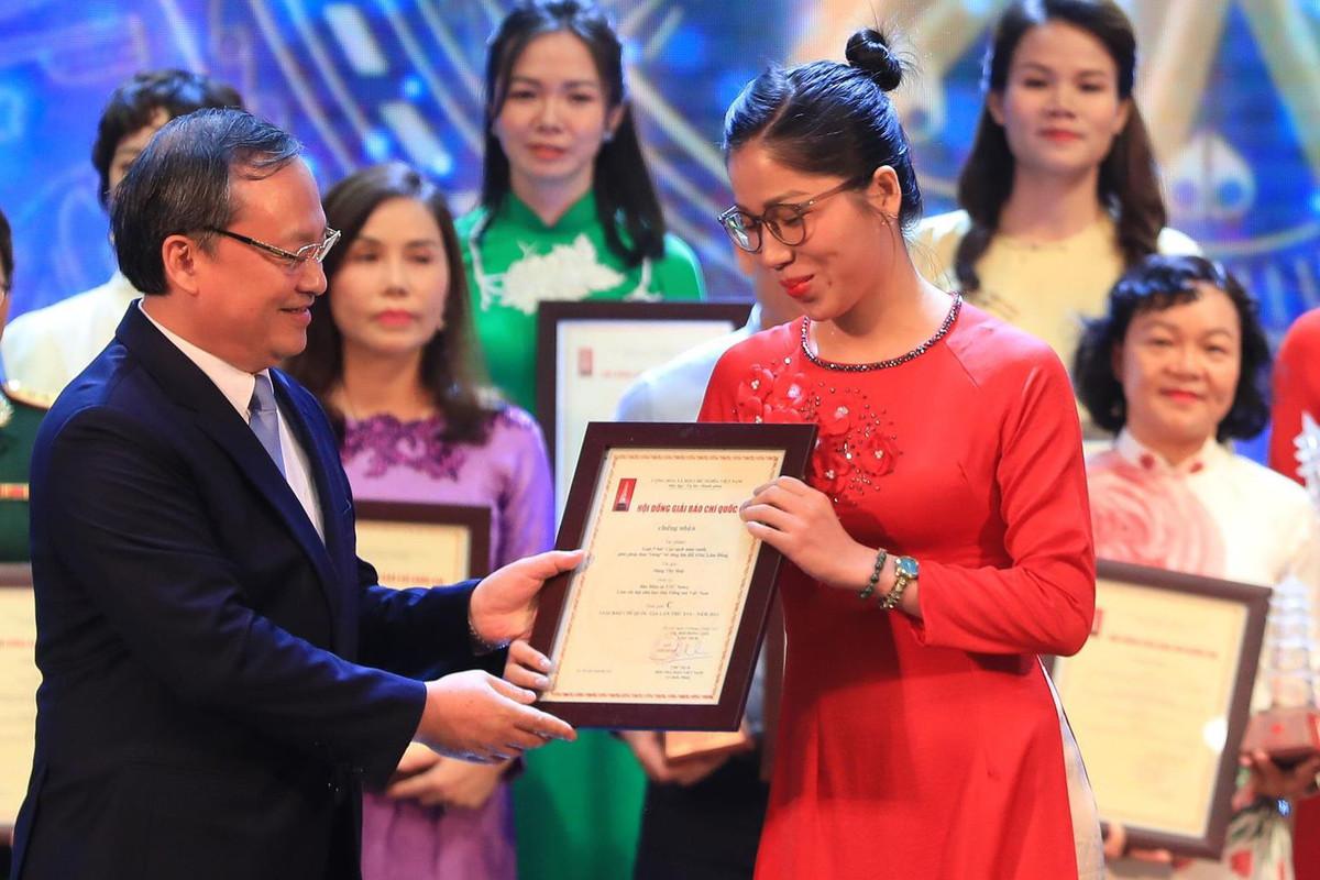 Nhà báo Đặng Thy Huệ - tác giả loạt bài "Cạo sạch màu xanh, phù phép đưa 'rừng' bê tông 41 ha ở Lâm Đồng" nhận giải C Giải Báo chí Quốc gia lần thứ XVI.