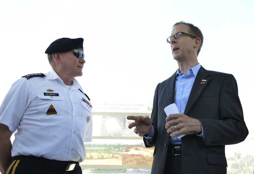 Tướng Martin Dempsey tới thăm nơi đặt hệ thống xử lý nhiệt Đà Nẵng, nơi đang xử lý 45.000 m3 đất nhiễm dioxin tại sân bay Đà Nẵng.