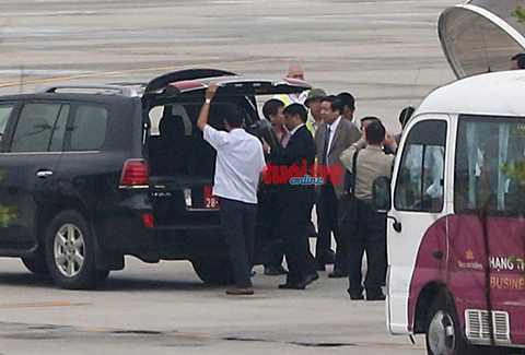 Trong lúc hành lý được đưa lên chiếc ôtô mang biển số quân đội tiếp cận máy bay, ông Thanh nán lại phía sau xe và chuyện trò với những người ra đón trước khi lên ôtô.