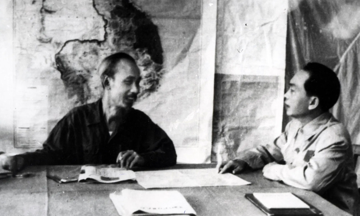 Chủ tịch Hồ Chí Minh trực tiếp giao nhiệm vụ cho Đại tướng Võ Nguyên Giáp nghiên cứu kế hoạch tác chiến và mở chiến dịch Điện Biên Phủ. (Ảnh: Tư liệu TTXVN)