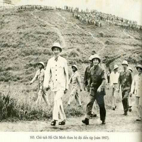 Bác Hồ và Đại tướng Võ Nguyên Giáp trong một chuyến thị sát bộ đội diễn tập năm 1957 |