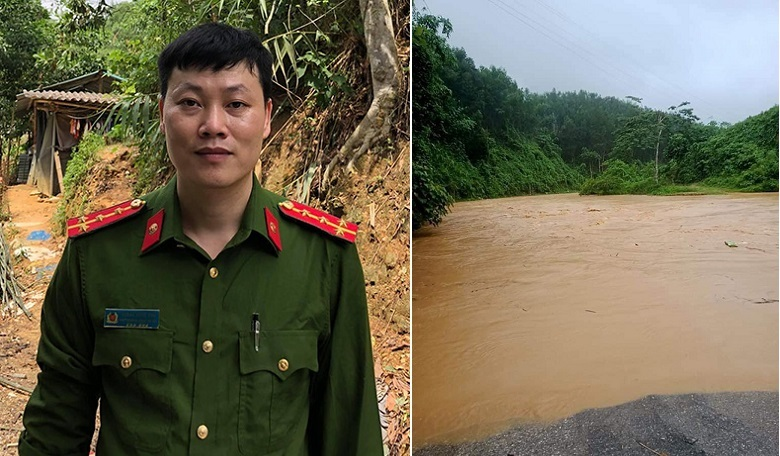 Đại uý Hoàng Ngọc Hào vật lộn với "tử thần" suốt 15 phút trong dòng lũ để cứu người. (Ảnh: Công an cung cấp)