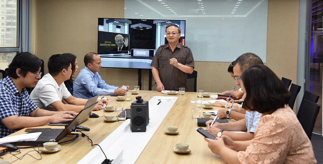 Tổng Giám đốc Đài Tiếng nói Việt Nam Đỗ Tiến Sỹ trao đổi với lãnh đạo và cán bộ Đài Truyền hình kỹ thuật số VTC về các phương án chuẩn bị cho Lễ Quốc tang.