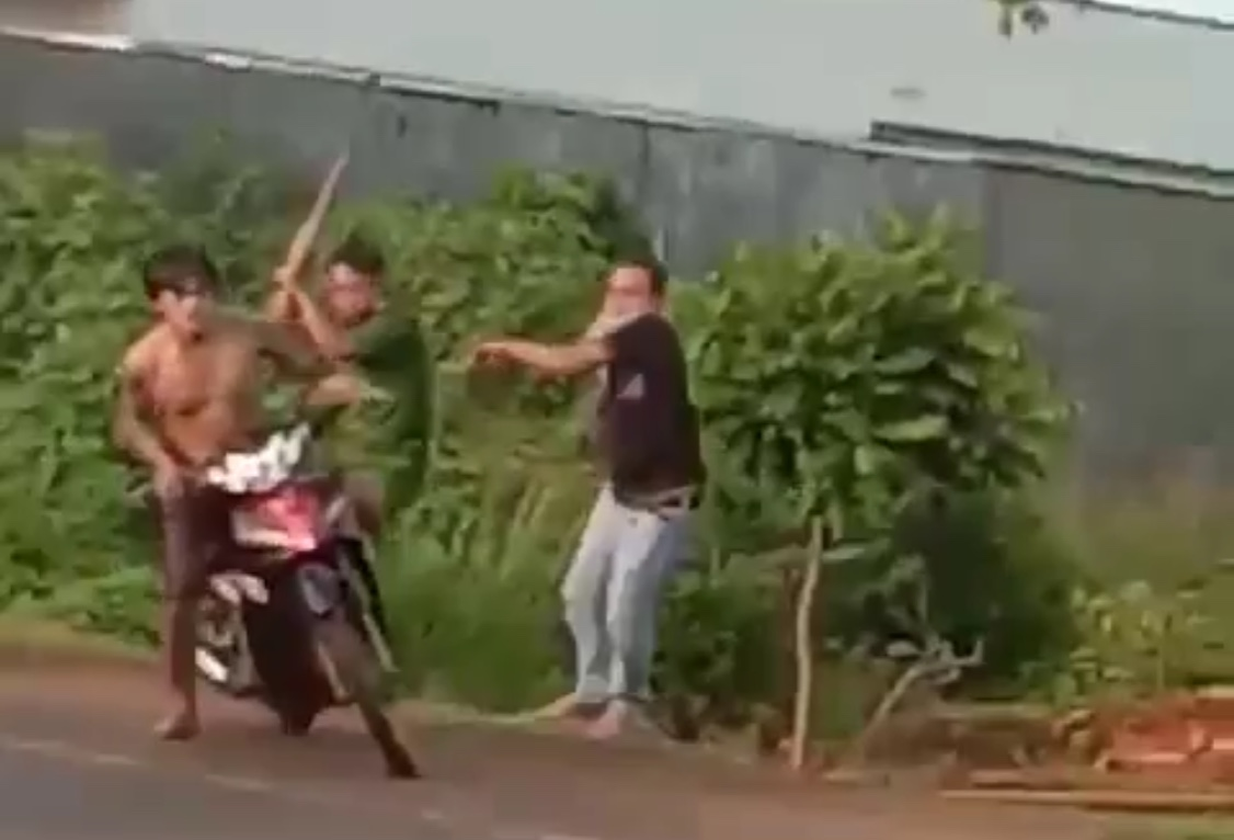 Trong clip, người mặc áo ngành công an đầu trần cầm khúc cây và được người dân chở đi để rượt người khác.