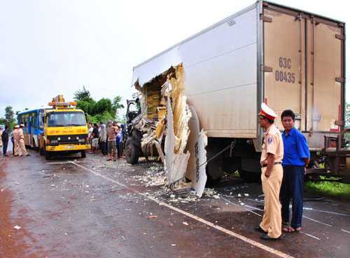Trưa nay 14/9, trên quốc lộ 14, đoạn qua xã Thuận Hạnh, H.Đắk Song (Đắk Nông), xe tải BKS 63C-00435, do Nguyễn Hoàng Sơn (45 tuổi, ngụ Tiền Giang) điều khiển đã va vào xe buýt BKS 47B-00193 (chưa rõ danh tính tài xế) chạy ngược chiều.