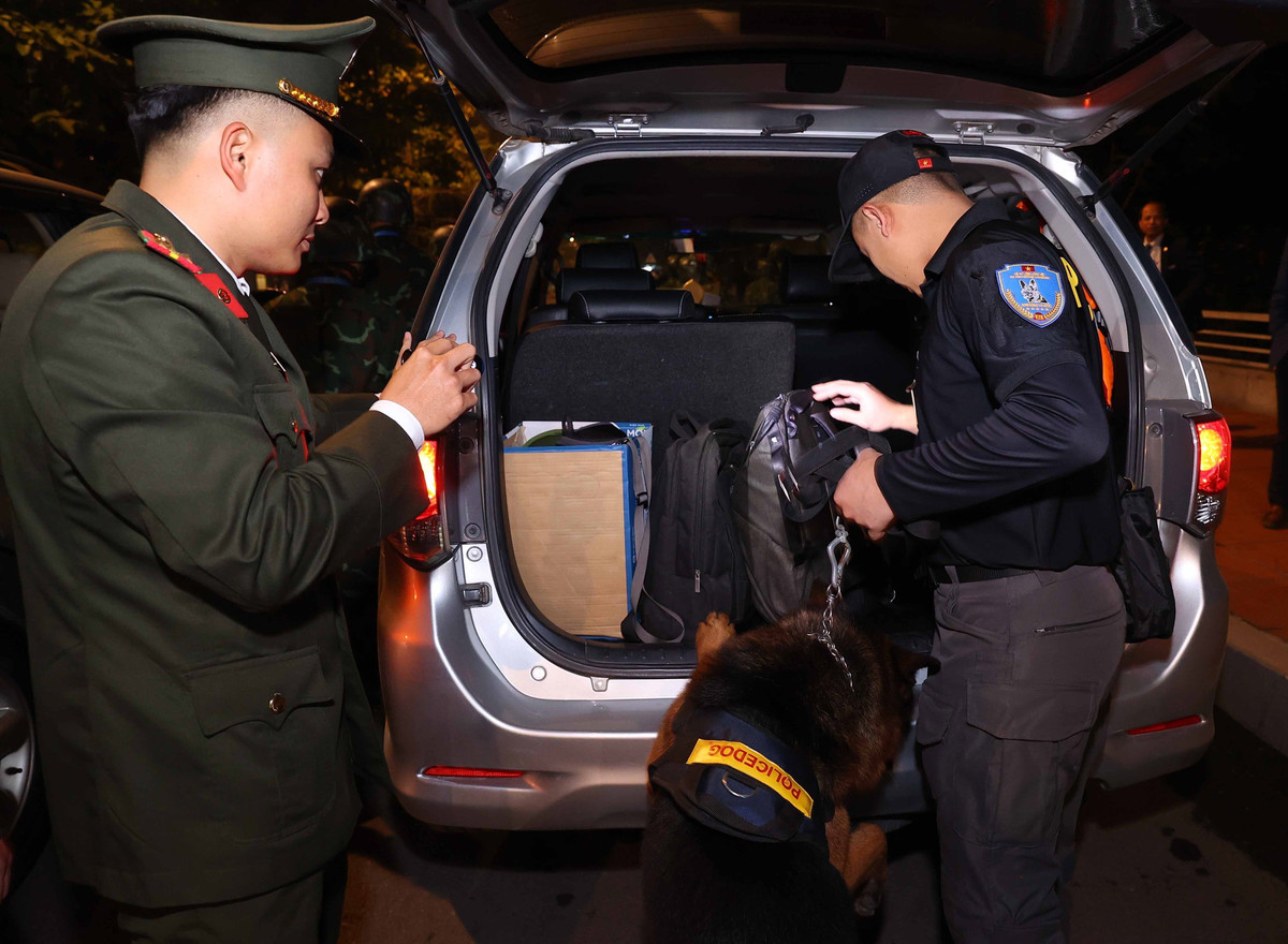 Lực lượng an ninh kiểm tra toàn bộ các phương tiện vào Trung tâm Hội nghị Quốc gia. (Ảnh: TTXVN)