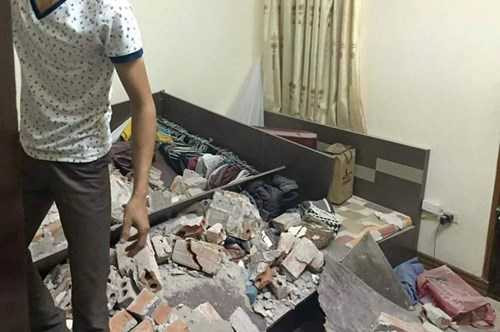 Tại hiện trường, căn phòng anh N. đang ở bị thủng một lỗ rộng khoảng hơn 2 mét, cao 3 mét. Trên nền nhà và trên giường vẫn còn vương vãi nhiều xi măng, gạch.