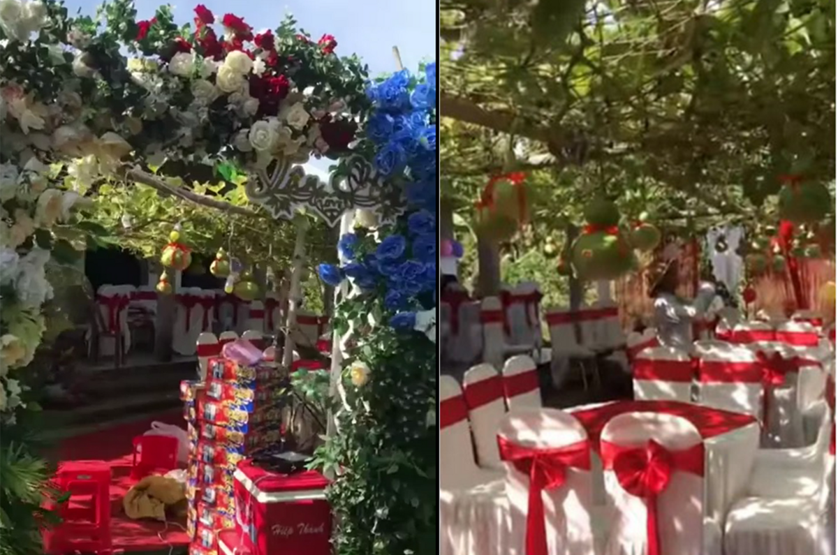 Không phải là rạp cưới sang trọng kết hoa lộng lẫy hay dải đèn lung linh, chiếc rạp cưới này vô cùng bình dân nhưng không kém phần độc và lạ. Mặc dù phía cổng chào được trang trí cổng hoa giống như bao đám cưới khác nhưng khi bước vào trong sân đám cưới, mọi người sẽ phải choáng ngợp với giàn bầu hồ lô chi chít quả.