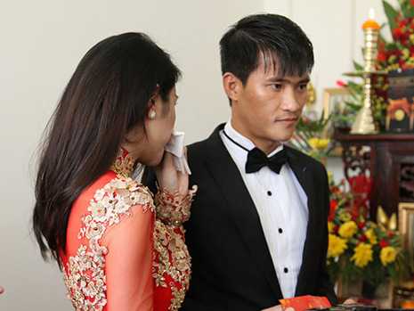 | Chú rể Công Vinh trao lễ vật cho cô dâu |