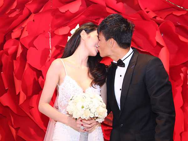 | Công Vinh và Thuỷ Tiên cắt bánh cưới |