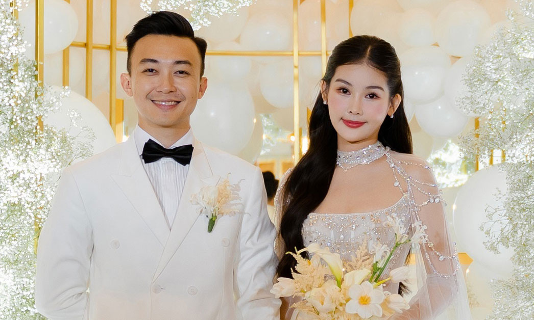 Chú rể Phan Tô Ny xuất hiện với ngoại hình bảnh bao, diện vest trắng lịch lãm, khuôn mặt điển trai. Cô dâu Ngân Anh xinh đẹp trong chiếc váy cưới đính hơn 1.000 viên đá swarovski nhập khẩu từ Áo. 5 nghệ nhân phải mất 180 tiếng lao động miệt mài để hoàn thành thiết kế độc đáo dành tặng cô dâu. Các chi tiết may đo, cắt ghép, đính kết,... đều thực hiện thủ công. Bông hồng xếp tay tạo điểm nhấn cùng phụ kiện bao tay đính hạt, áo choàng và dòng chữ thêu tay tỉ mỉ.