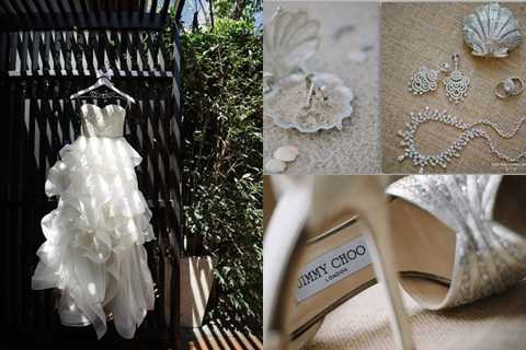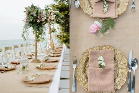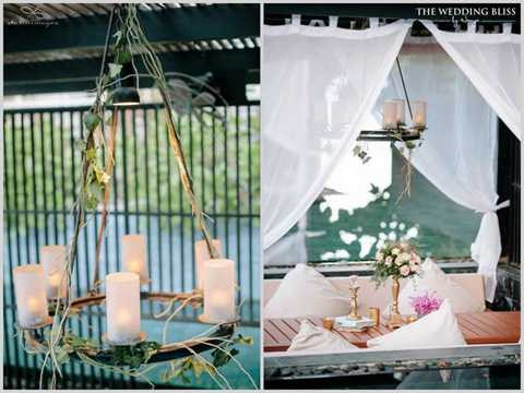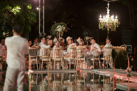 | Lễ cưới chính được tổ chức ngoài trời, tiếp theo đó là dạ tiệc bên bể bơi trong khuôn viên resort. Hoa hồng, cát tường và hoa baby trắng đính trên ghế của khách mời. Tiệc tối được tổ chức bên bể bơi sát biển. Những dãy bàn tiệc dài trang trí theo phong cách rustic nhẹ nhàng, trẻ trung. |