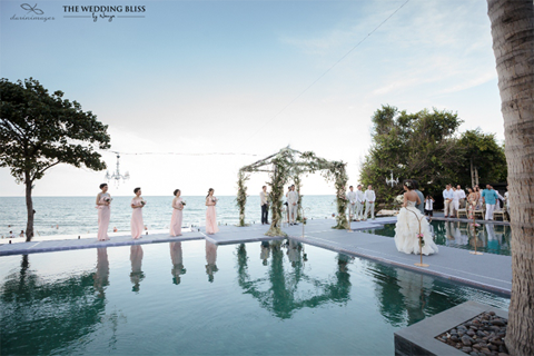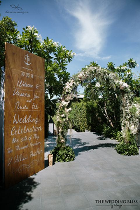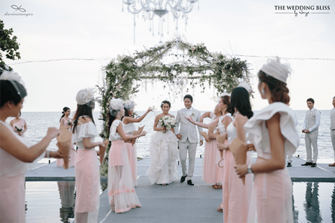 | Đám cưới đẹp như mơ của cặp đôi tỷ phú trẻ được tổ chức trong một resort 6 sao tại đảo Hua Hin (Thái Lan). Yêu thích sự đơn giản, tinh tế, cô dâu Yui lựa chọn màu trắng là tông màu chủ đạo của tiệc cưới. |