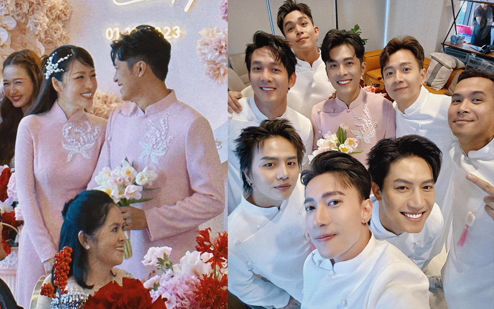 Trong khi đó, đội hình bê tráp nhà trai cũng không kém cạnh khi hội tụ toàn mỹ nam như Song Luân, Jun Phạm, Ngô Kiến Huy, Anh Tú... Đây đều là những người bạn thân thiết với cả hai vợ chồng.