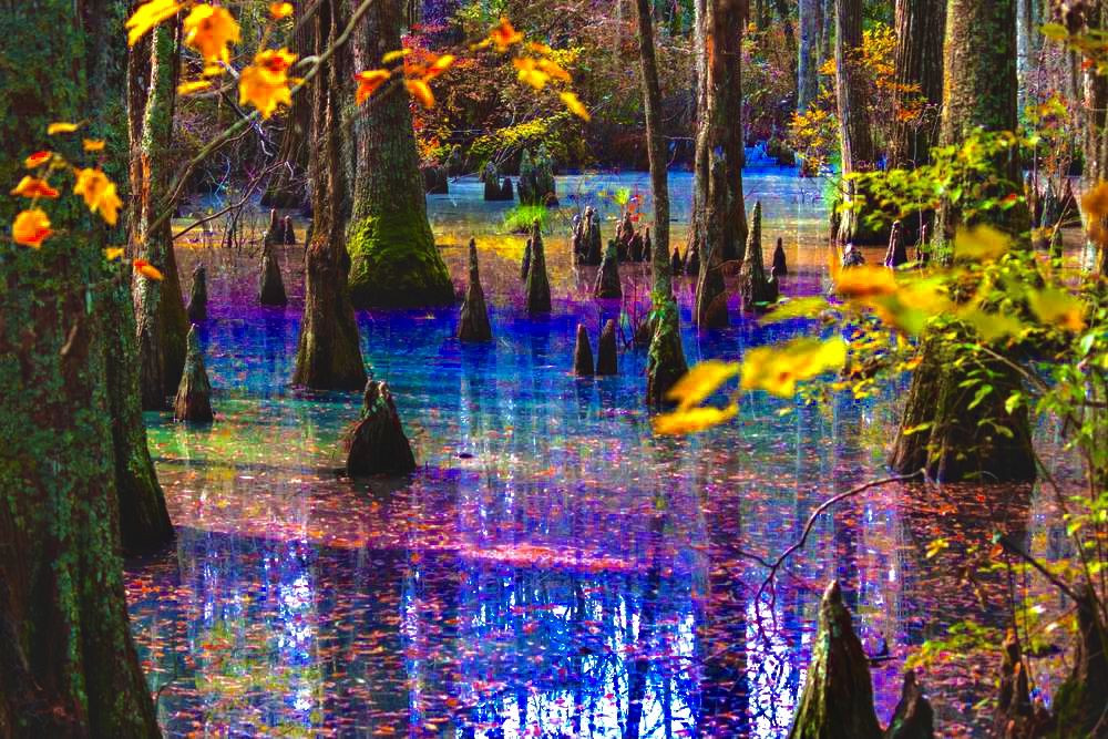 Lăng kính sống động soi khắp đầm lầy. Đó là khi Mẹ Thiên nhiên đang thực hiện “phép thuật” của mình. Trong điều kiện hoàn hảo, một mô hình màu hồng, tím, xanh lam và vàng phủ khắp mặt nước dưới những bóng cây khô cằn. Cả khu rừng như bừng sáng lung linh hệt như xứ thần tiên.