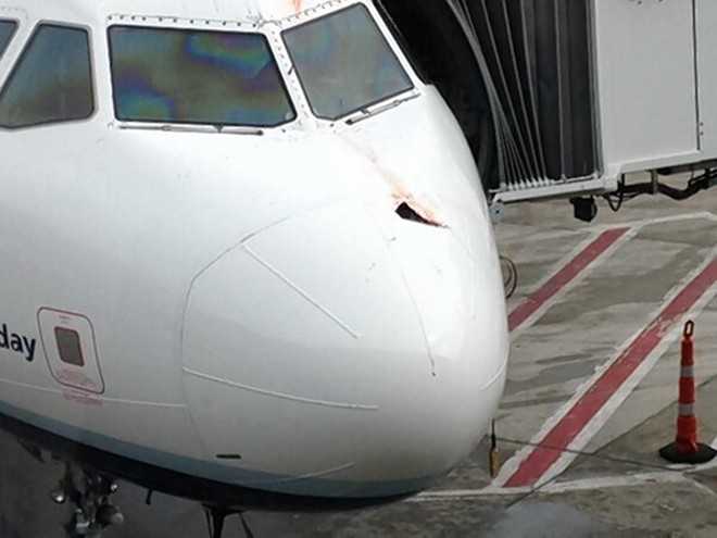 | Lỗ thủng và vết máu chim trên mũi máy bay. Ảnh: NY Daily News. |