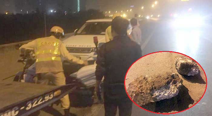 Theo đó, khoảng 21h50 ngày 25/3, anh Kh. lái xe Range Rover trên đường vành đai 3 trên cao (đoạn vòng cua trước toà nhà Keangnam hướng về phía Cầu Giấy, Hà Nội) thì gặp phải “trận địa phế thải xây dựng” do một số xe chở vật liệu làm rơi vãi xuống đường.