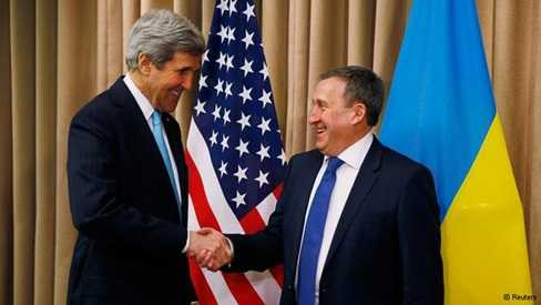 | Ngoại trưởng Mỹ John Kerry (trái) gặp quyền Ngoại trưởng Ukraine Andriy Deshchytsya tại cuộc gặp song phương ở Geneva ngày 17/4. |