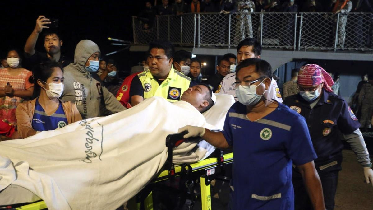 Một thủy thủ được giải cứu từ tàu hộ tống HTMS Sukhothai và được chuyển vào đất liền tại cảng Bang Saphan, tỉnh Prachuap Khiri Khan, Thái Lan, hôm 19/12. (Ảnh: Anuthep Cheysakron/AP)