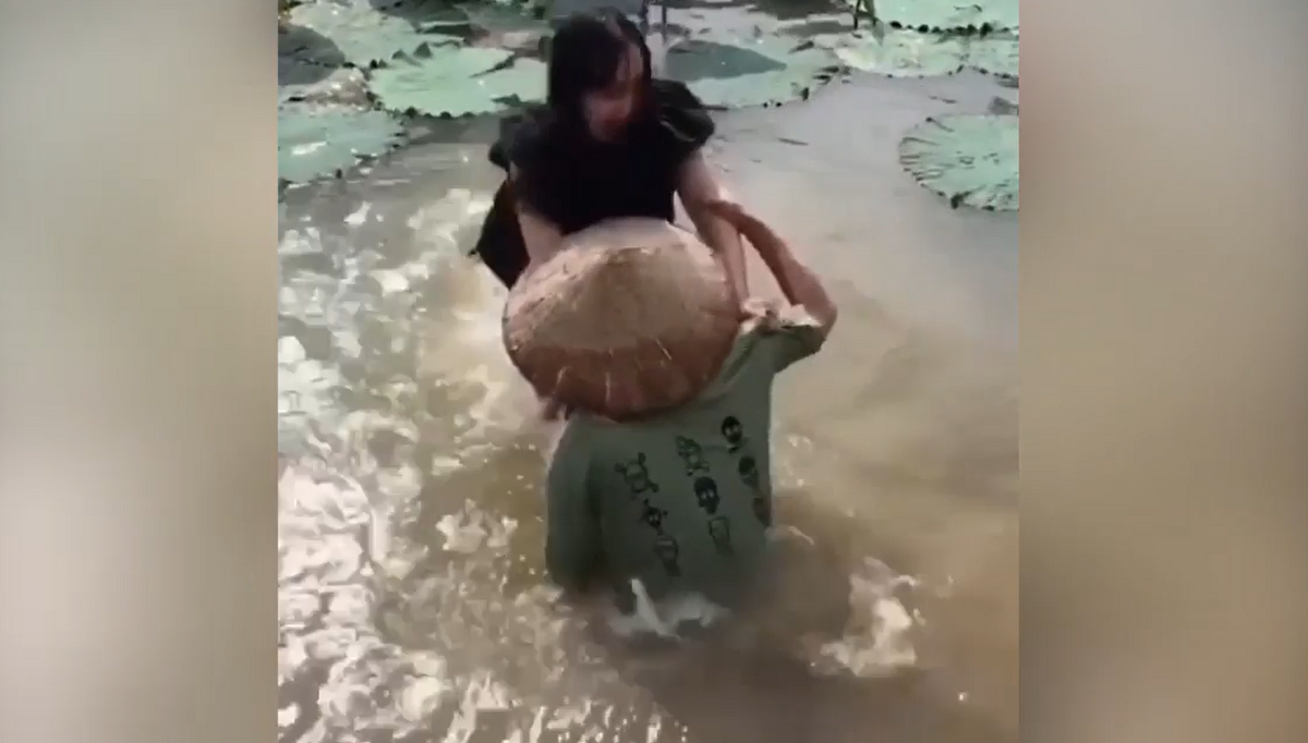 Chưa quen với việc đi thuyền người đẹp sợ hãi thấp thỏm, đứng ngồi không yên khiến thuyền chìm, hai người lóp ngóp trong nước.