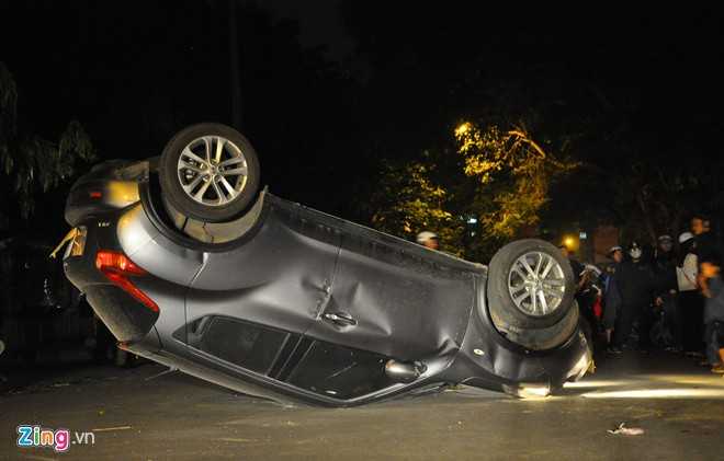| Chiếc Nissan Juke lật nghiêng giữa đường Kim Mã tối 24/4. Ảnh: Hoàn Nguyễn. |