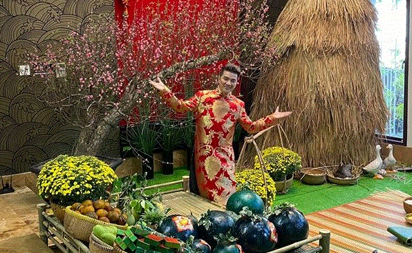 Nam ca sĩ cất công đặt cành đào từ Bắc chuyển vào TP.HCM, bày những giỏ hoa cúc, dưa hấu, ụ rơm, bánh chưng... để tạo không khí Tết.